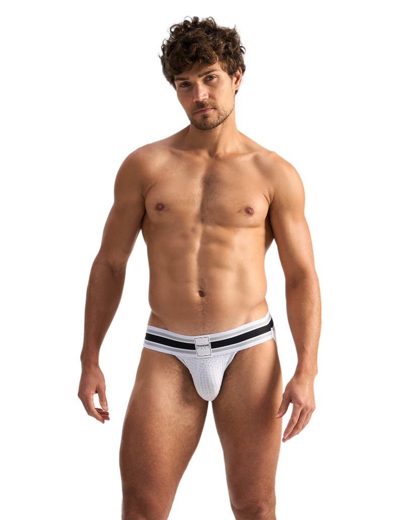 Locker Room Jockstrap – Classic jock cut with a bold 6cm striped waistband, featuring a waffle weave pouch for superior breathability and a center-front logo patch. Designed in 4 striking colourways with top-tier support and construction.